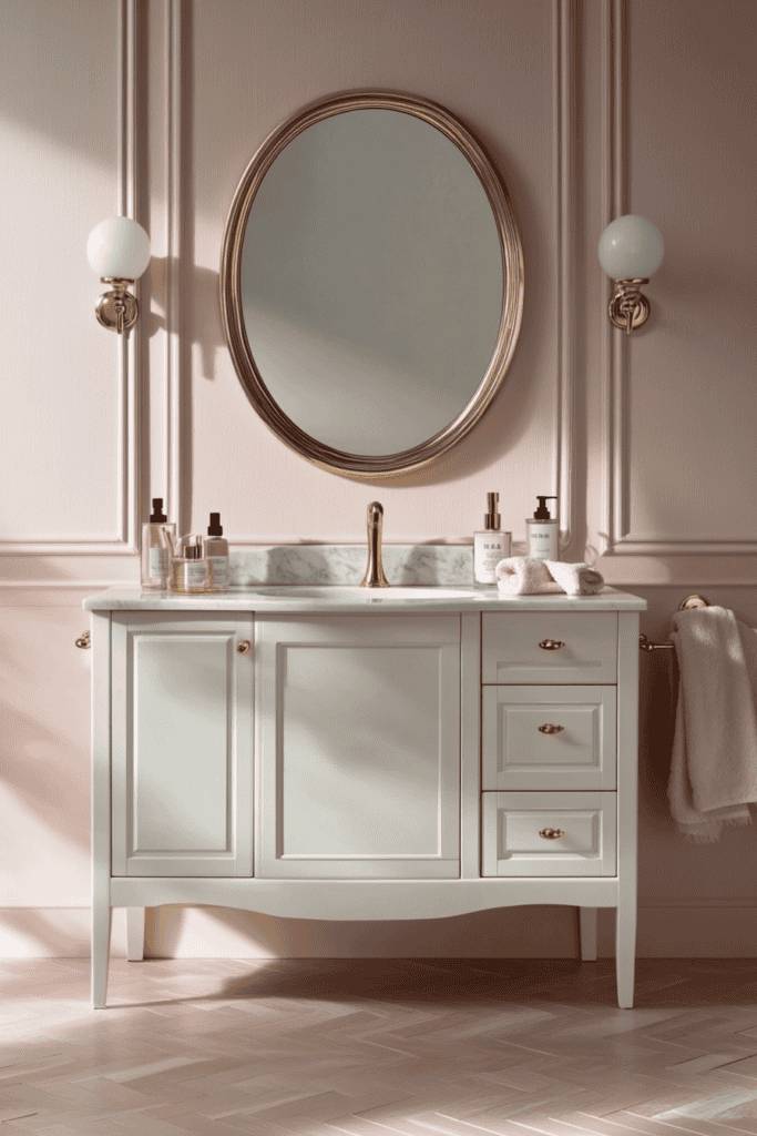 Elevate your bathroom’s elegance with blush pink walls featuring classic paneling. Pair this refined backdrop with a white vanity topped with marble for a timeless look. Gold accents, such as the mirror frame, faucets, and light sconces, add a luxurious touch. The soft pink tones paired with sophisticated textures create a space that feels both opulent and inviting.