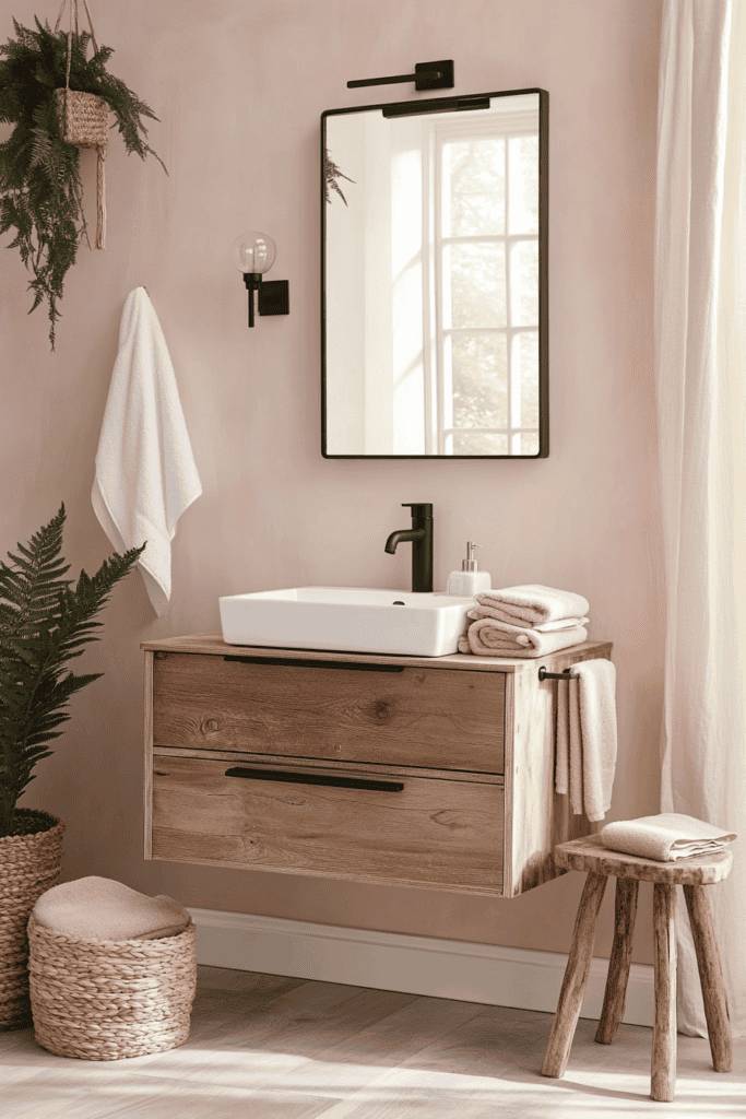 For a rustic-meets-modern vibe, combine soft pink walls with natural wood finishes. A floating wooden vanity paired with a rectangular black-framed mirror offers a stylish yet earthy aesthetic. Add texture with woven baskets, a small stool, and lush greenery to create a warm and approachable bathroom that radiates charm.