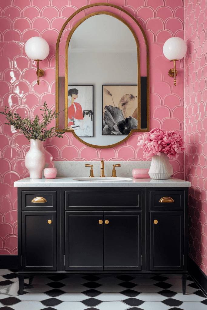 Go bold with scalloped pink tiles that make a statement. Pair them with a striking black vanity and gold hardware to achieve a perfect balance of drama and elegance. The combination of vibrant pink, dark tones, and metallic accents creates a glamorous and modern bathroom design. Add a touch of softness with fresh flowers or greenery.