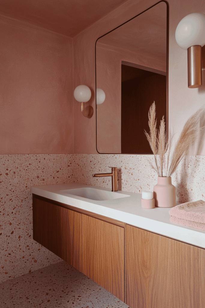 Pink terrazzo walls and floors offer a playful and contemporary vibe. Combine this with wooden cabinetry and gold fixtures for a bathroom that feels trendy yet cozy. Soft lighting and pampas grass in pink-toned vases can further enhance the natural warmth of this design while keeping it modern and chic.