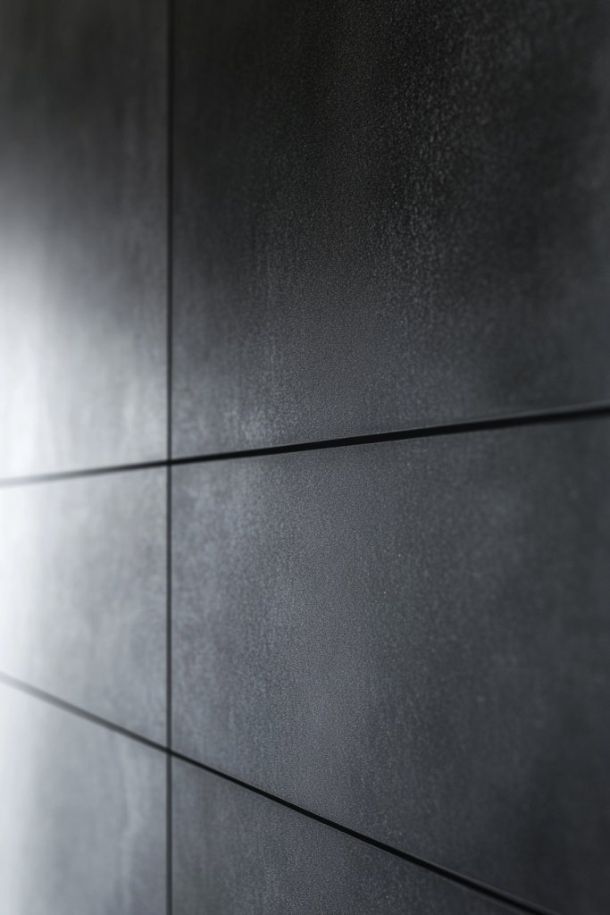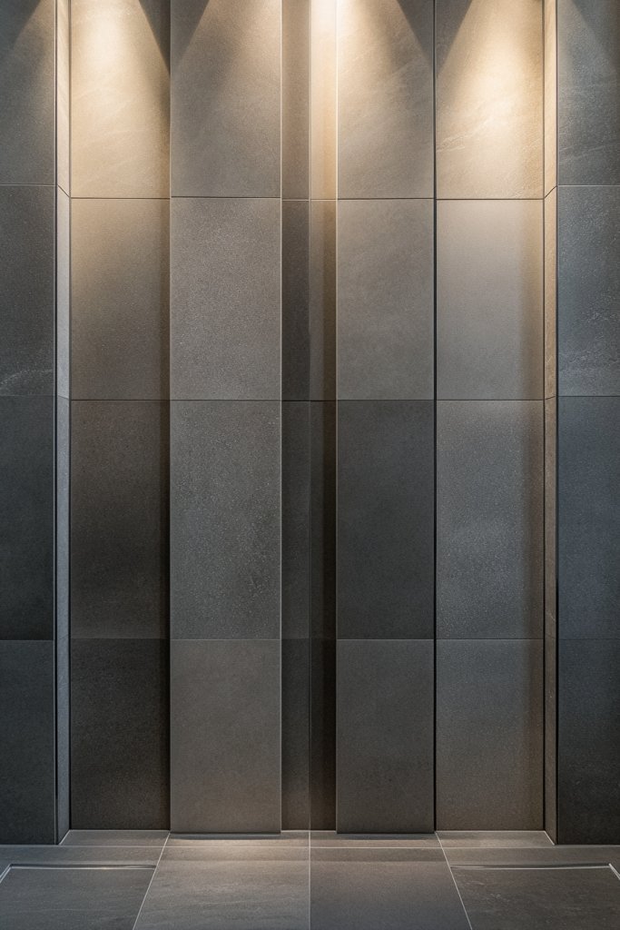 Imagine tall, slender porcelain slabs installed from floor to ceiling, emphasizing vertical lines. The elongated shapes draw your eye upward, giving a sense of grandeur. Choose subtle tones or textured surfaces to add depth without overwhelming the space. The seamless look of large panels adds to the minimalist aesthetic, making the room appear taller and more airy.