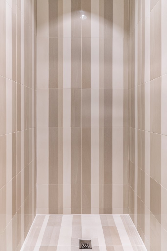 Imagine thin porcelain strips stacked vertically from floor to ceiling, creating bold or subtle stripes depending on your color choices. The vertical lines draw the eye upward, emphasizing height and adding a sense of movement. Alternating finishes like matte and gloss can add further depth and interest to the stripes. This pattern turns a simple shower into a statement of modern design.