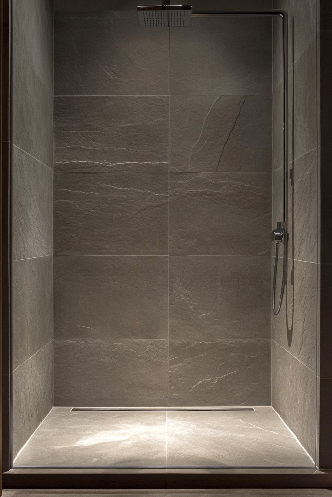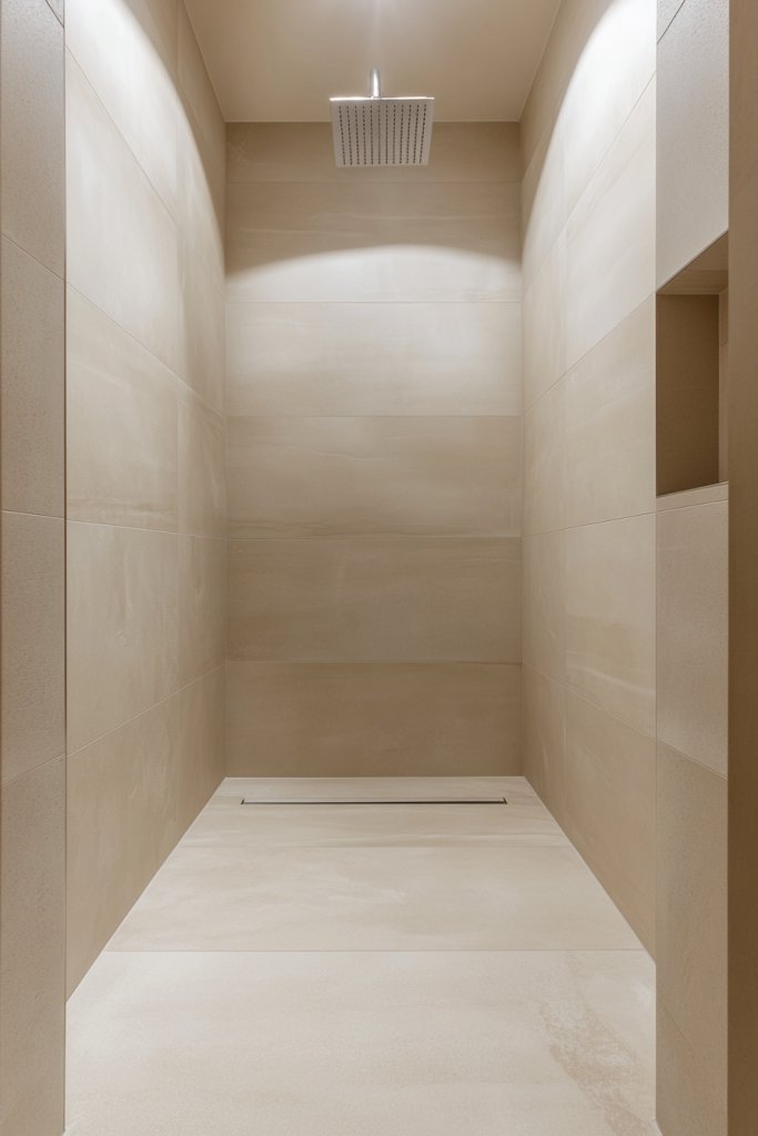 Picture large porcelain slabs installed from the floor all the way to the ceiling, with no joints breaking the surface. The uniformity creates an endless, enveloping feeling that makes the shower space feel larger. The subtle play of light on the large panels adds depth and elegance, especially with polished or semi-gloss finishes. It’s a simple yet dramatic transformation.