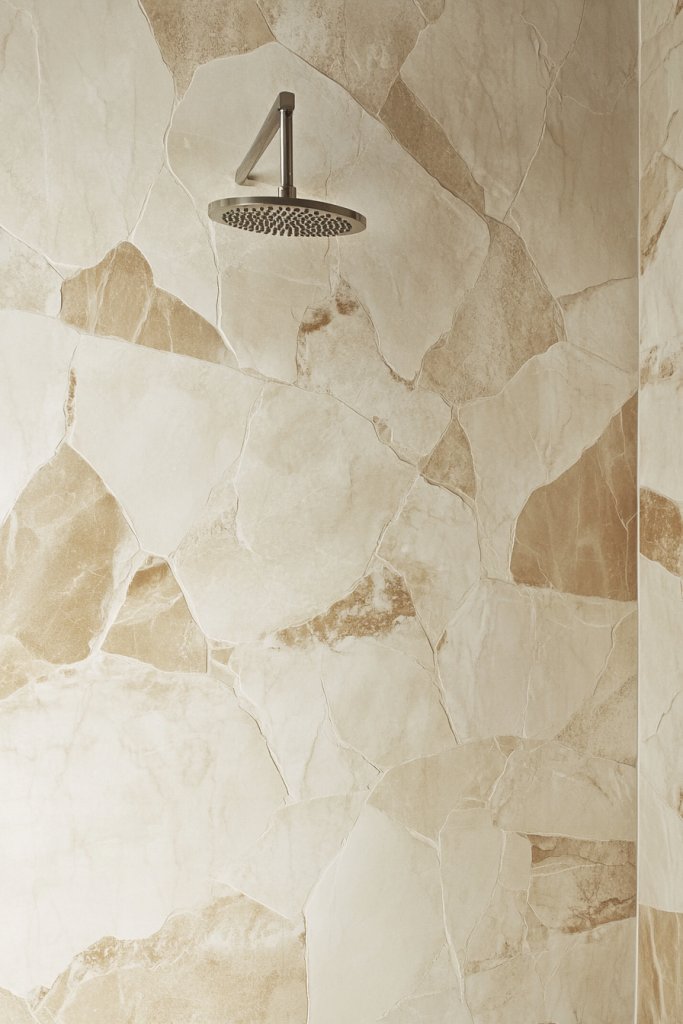 Visualize porcelain slabs cut into triangles, trapezoids, or irregular shapes, arranged in a seemingly random yet carefully curated pattern. The asymmetry creates movement and visual interest, drawing the eye around the space. Mix finishes—matte, gloss, textured—to enhance the geometric effect. The varied shapes and angles give your shower a custom, edgy appearance.
