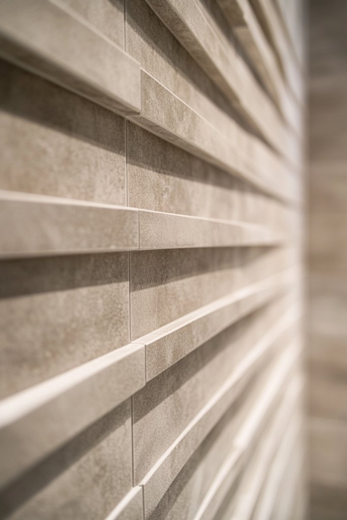 Feeling like your bathroom needs a boost of height and energy? Narrow, vertically oriented porcelain slabs create a striking striped effect that elongates your walls. It’s an easy visual trick to make your shower feel taller and more dynamic. If you’re tired of flat, wide surfaces, this pattern adds a fresh twist.