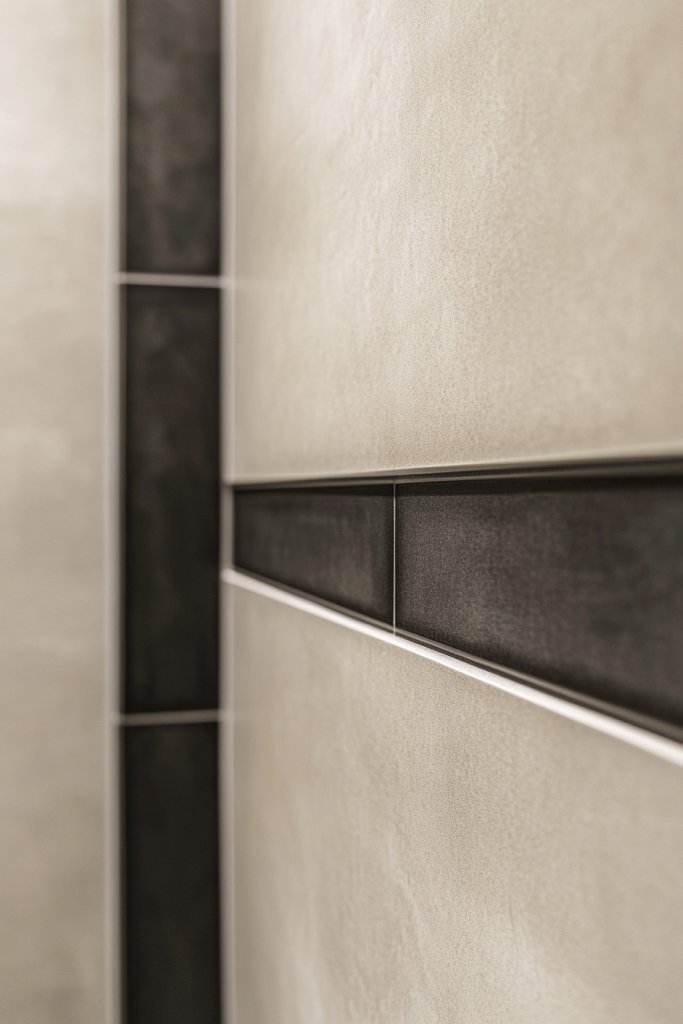 Picture a clean, large porcelain slab with a sleek, dark border running along the edges. The contrast draws the eye outward, framing the shower walls with a subtle yet striking outline. Alternatively, use a lighter border to soften the transition between walls and ceiling. The borders can be in matte or glossy finish, matching fixtures or hardware for a cohesive look. This framing technique creates a gallery-like effect that feels both modern and refined.