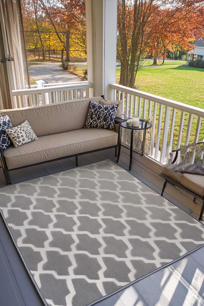 Is your porch feeling a bit disconnected or plain? Adding a stylish, weather-resistant rug can tie the space together beautifully. It creates a defined area for seating or decor and instantly upgrades the look. Plus, it adds comfort underfoot—because who wants cold, hard surfaces?