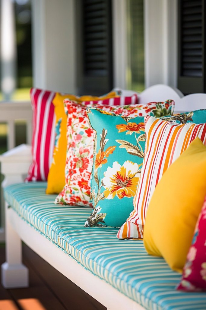 Imagine a set of cushions in lively patterns—stripes, florals, or geometric shapes—draped over weather-resistant chairs. The textures add depth, while bold colors create a lively, cheerful vibe. Toss in a few throw pillows with tassels or embroidery for extra flair. The combination of textures and hues makes your porch feel cozy and stylish.