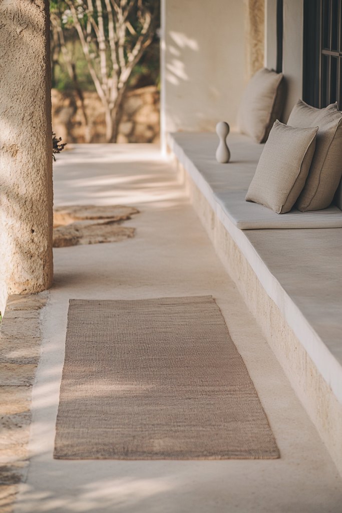 Picture a bold-patterned rug in vibrant colors under a seating area, or a neutral woven piece anchoring a minimalist porch. The textured fibers add depth and warmth, contrasting with smooth stone or wood. When the sun hits it just right, the colors pop and make your entire porch feel more lively. It’s a simple way to add personality and coziness.