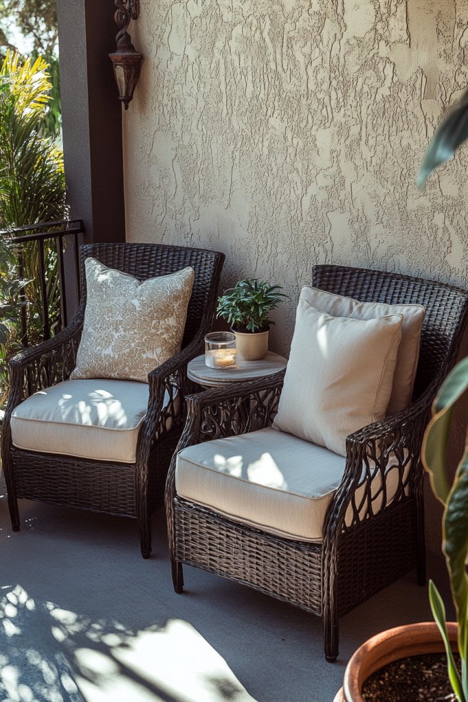 Imagine a pair of weather-resistant armchairs with plush cushions and soft throws, arranged around a small side table. Think of textured pillows in muted hues or lively patterns that add personality. The chairs are set at just the right angle for conversation, with a background of string lights casting a warm glow. It’s a little slice of outdoor comfort that beckons you to sit down and relax.