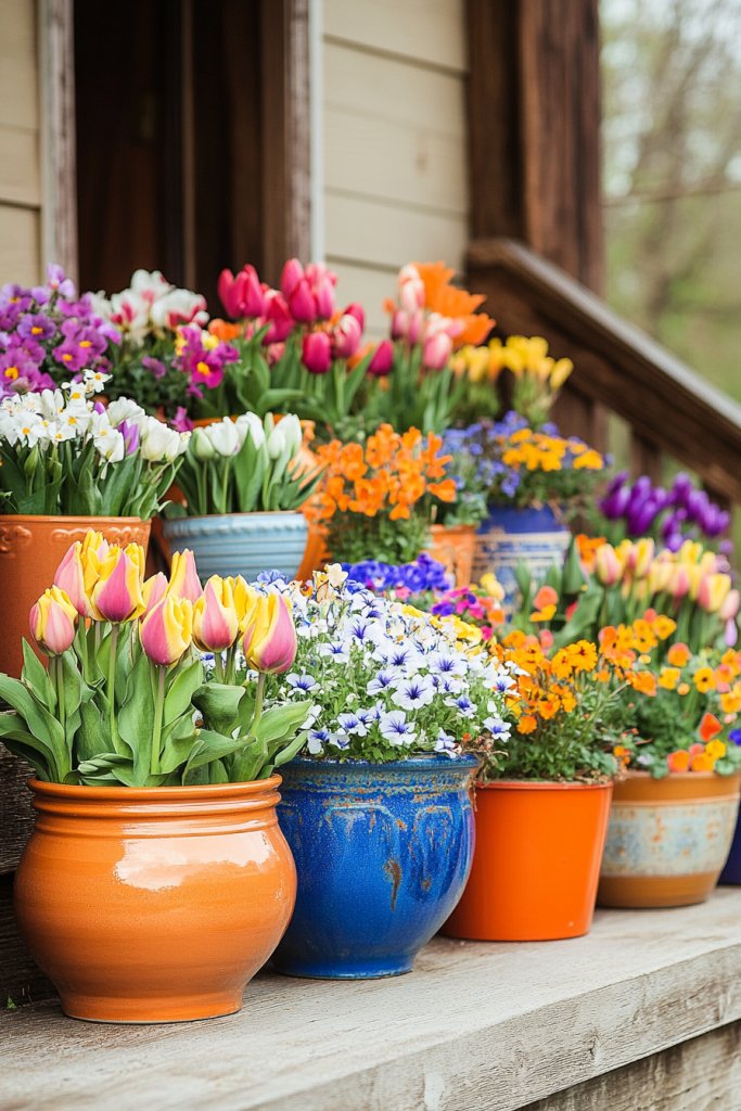 Picture tall terracotta pots bursting with bright petunias in summer or cozy mums in fall. Imagine a mix of textures—lush blooms, trailing vines, and spiky succulents—arranged in mismatched planters for a charming, curated look. The vibrant colors pop against neutral porch walls, creating a cheerful, inviting scene. The scent of fresh blooms completes the sensory experience.