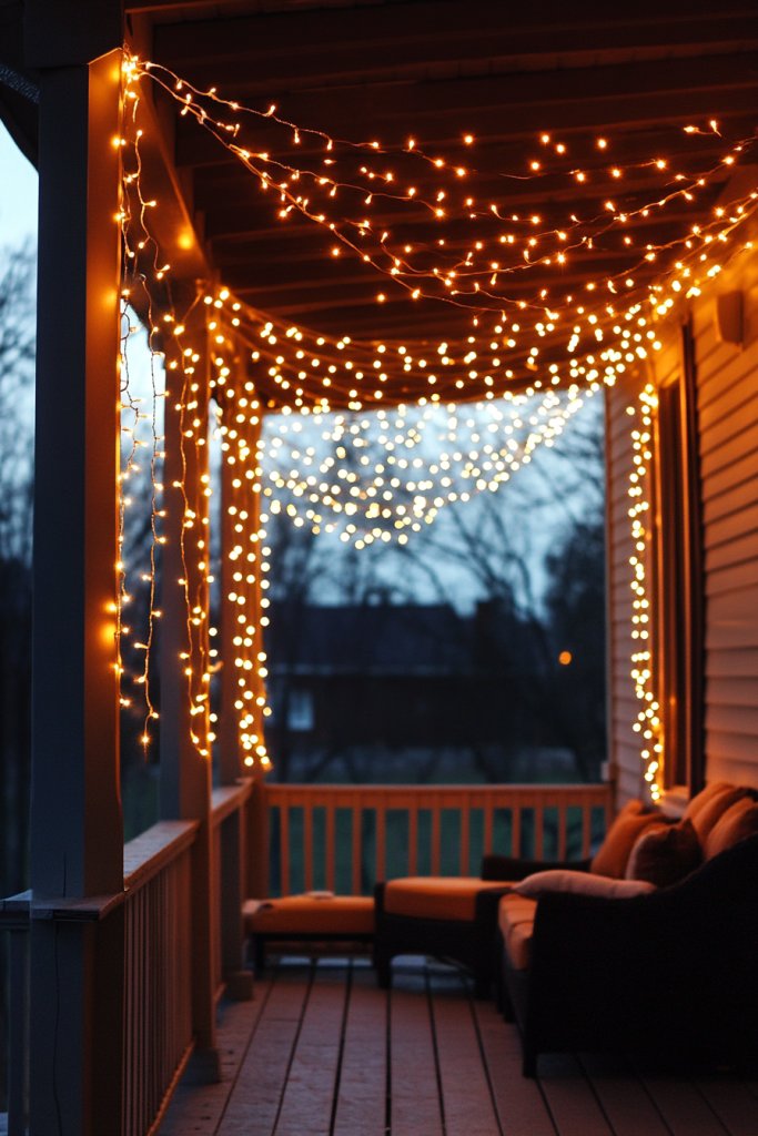 Imagine delicate fairy lights draped along the porch railing, casting a warm shimmer across textured wood and cozy seating. The tiny bulbs twinkle subtly, creating a starry effect that’s both charming and calming. The gentle light reflects off decorative pillows and textured throws, making everything look more inviting. It’s like bringing a bit of the night sky right to your doorstep.
