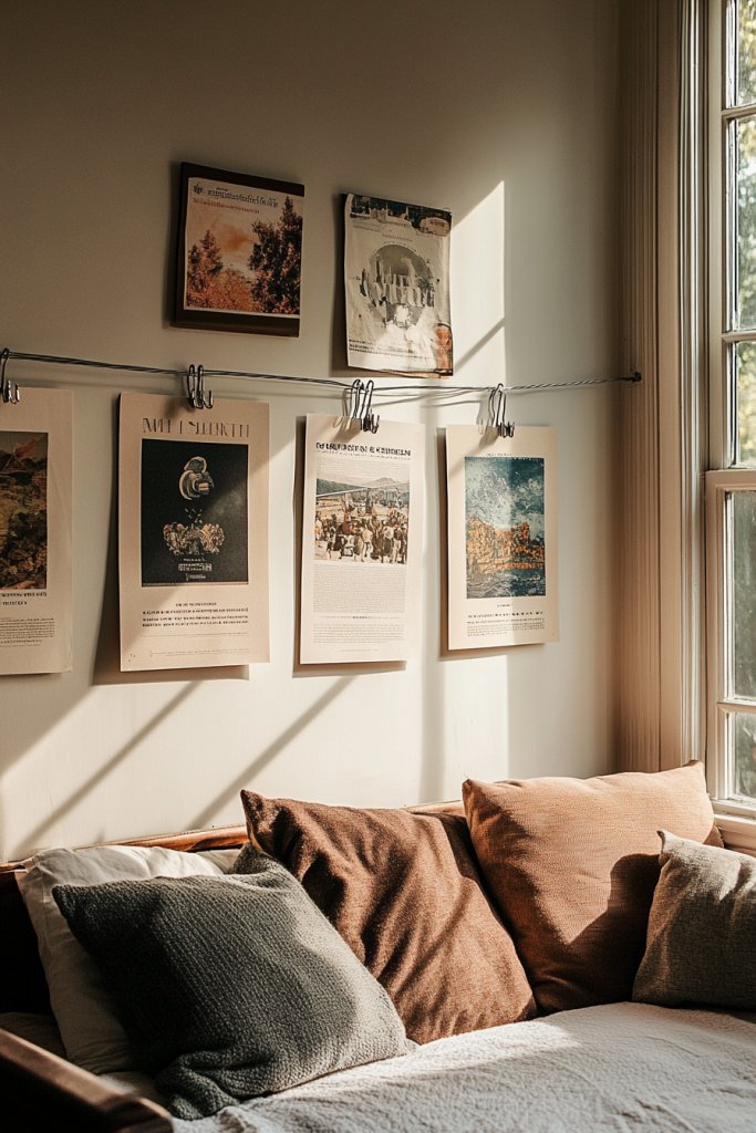 Picture a sleek wire stretched across a section of your wall, with colorful clips holding posters or prints. The posters hang loosely, creating a relaxed, artful display that feels effortless. The wire can be mounted with small hooks or nails, and you can add decorative elements like fairy lights or small fabric banners to enhance the look. The entire setup feels playful and adaptable.