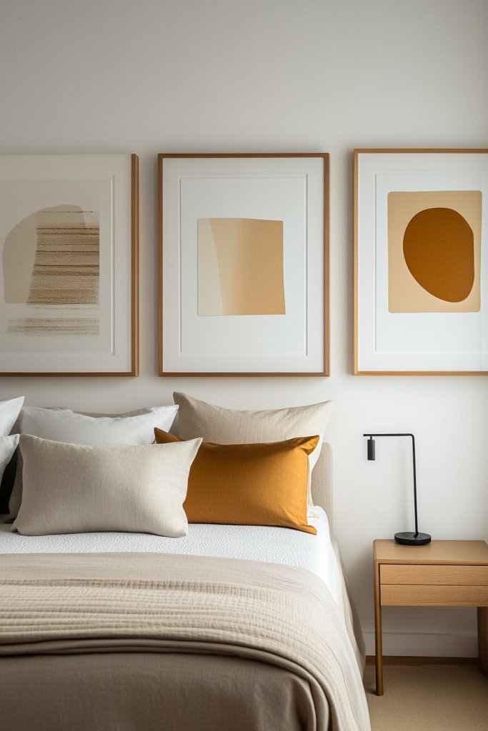 Imagine a simple geometric print in monochrome or a subtle abstract piece in soft pastels hanging above your bed. These pieces add visual interest while maintaining a clean, uncluttered look. The art’s minimal lines and shapes create a calming effect, making the room feel cohesive and intentional. Framed in sleek black or white, they blend seamlessly into modern decor.