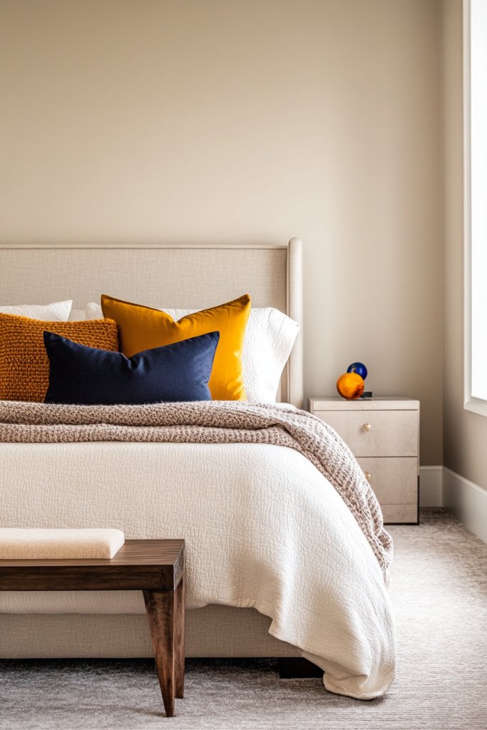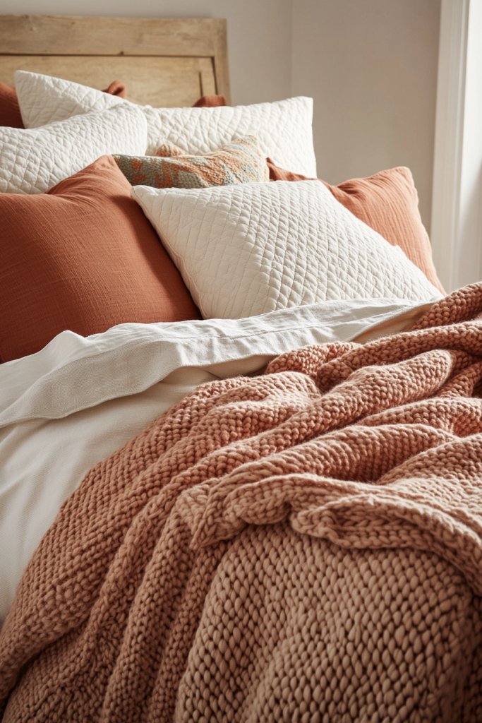 Imagine a bed layered with vibrant cushions in jewel tones—emerald greens, ruby reds, or sunshine yellows—that catch the light and draw your eye. Picture a chunky knit throw in a bold hue draped over the side, inviting you to snuggle. These pops of color make the whole room feel warmer and more welcoming. It’s like a visual hug every time you walk in.