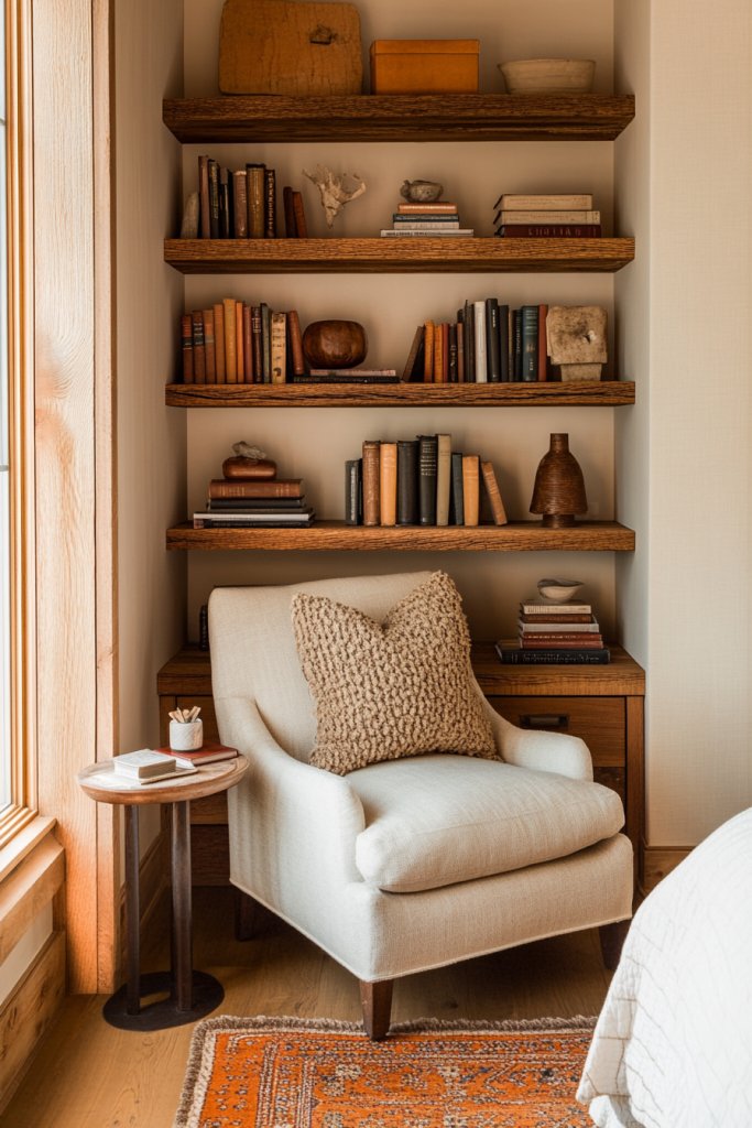 Adjust the size based on your space—small alcoves can hold a comfortable chair and a narrow shelf, while larger areas can host a built-in bench or window seat. Match the shelving style to your decor—sleek modern, rustic wood, or vintage-inspired. Change the ambiance seasonally with cozy textiles or bright accents. If space is tight, consider tiered shelves or floating units that don’t eat into precious floor space.