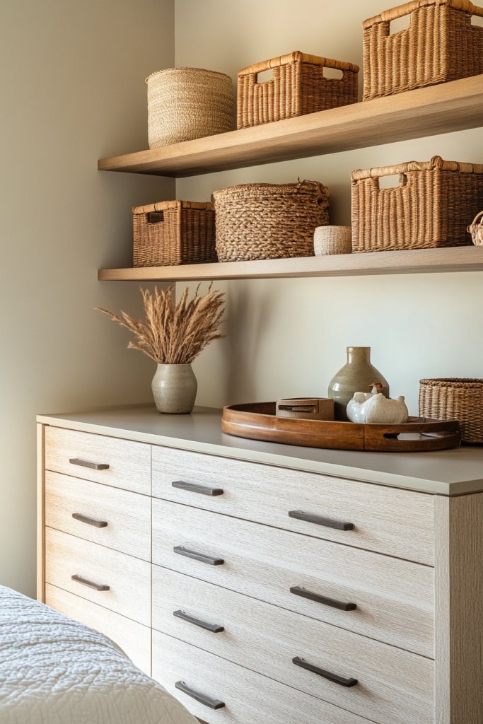 Picture decorative baskets stacked neatly in a corner, sleek under-bed drawers, or open shelving with curated accessories. These solutions hide away clutter while adding visual interest—think woven textures, metallic accents, or colorful containers. Items are within reach but out of sight, maintaining a tidy, polished look. When well-organized, your bedroom feels less chaotic and more intentional.