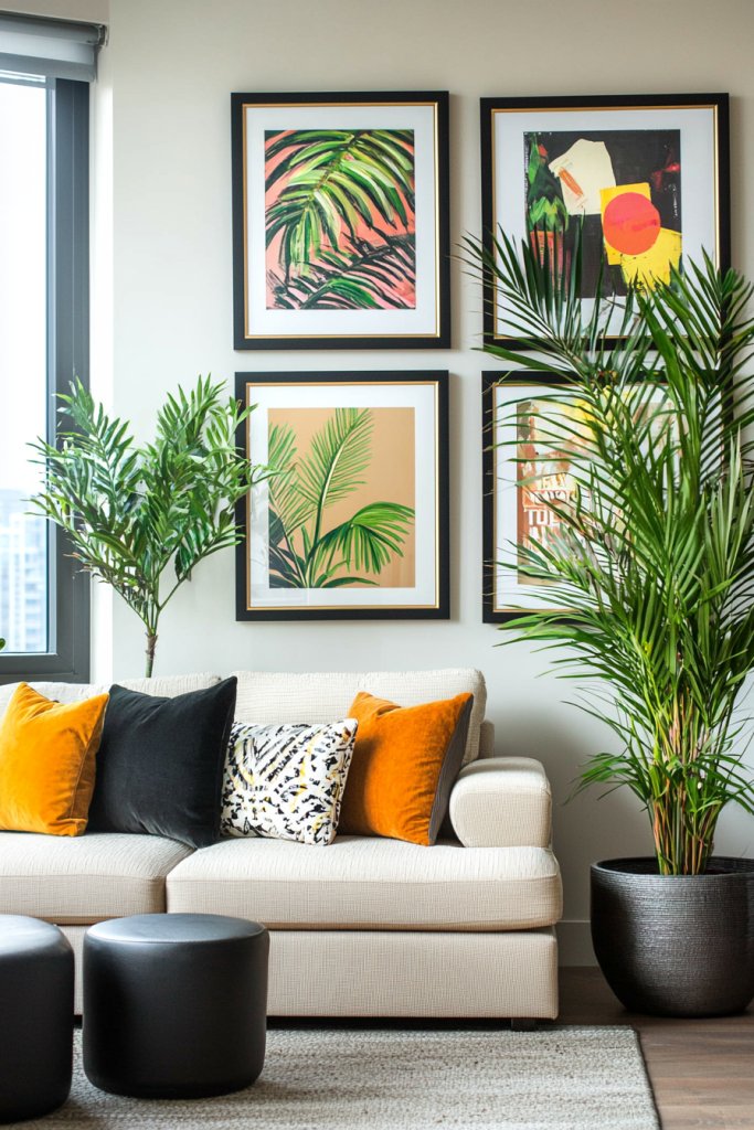 Mix and match framed art, photographs, and even textiles to create visual interest. Don’t shy away from varying frame styles and sizes; this adds depth and character.