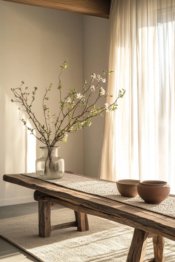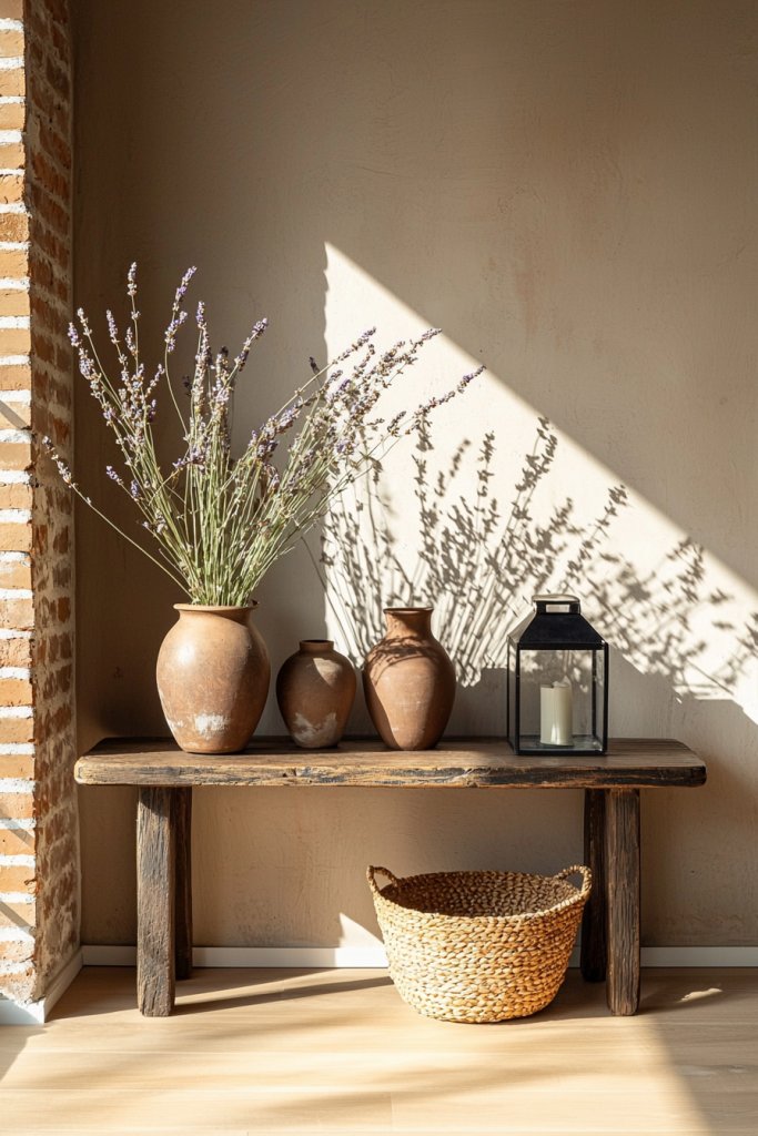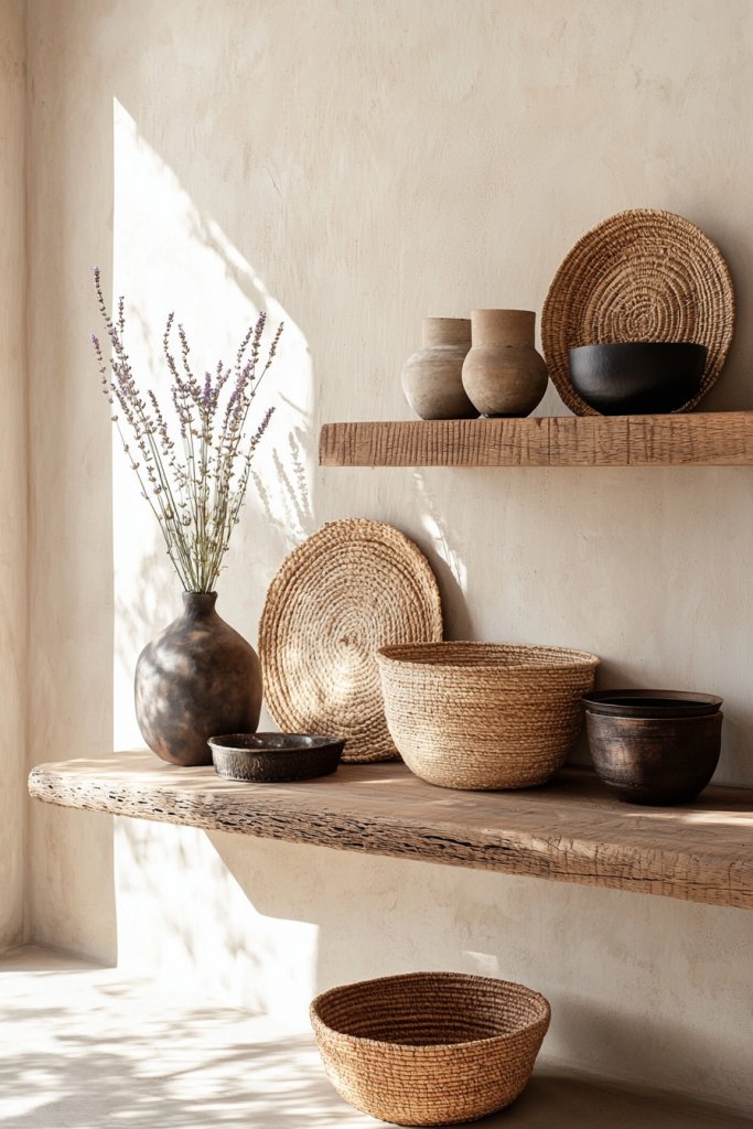 Think of a rustic wooden shelf, its grain showcasing years of life, or handmade pottery that adds an earthy touch to your dining table. Incorporate woven baskets for storage, blending functionality with charm.
