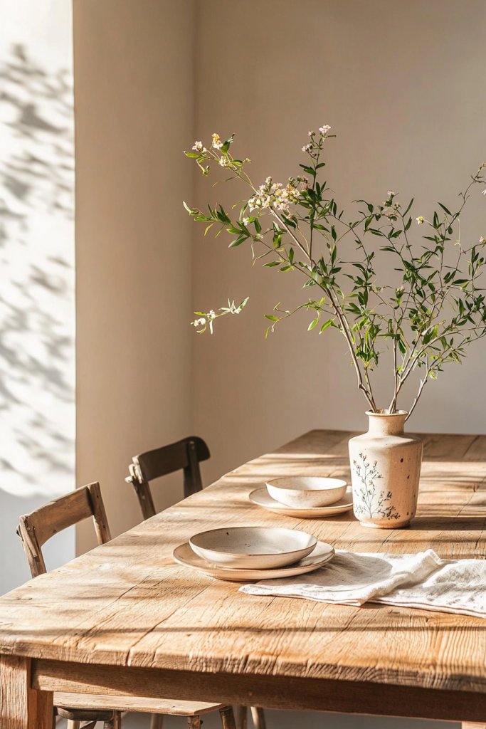 To accessorize, consider a simple centerpiece like a vase filled with wildflowers or a rustic table runner. This will create an inviting atmosphere, perfect for fostering connections and celebrating the simple joys of life. A vintage farmhouse table truly embodies the spirit of togetherness in your home.