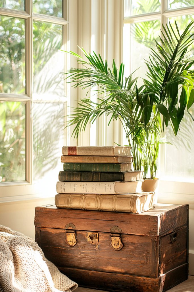 Stack a few vintage books on a coffee table, their worn covers and yellowed pages sparking curiosity and conversation. Look for trunks with patina or unique hardware, using them as functional storage while doubling as eye-catching coffee tables or side tables.