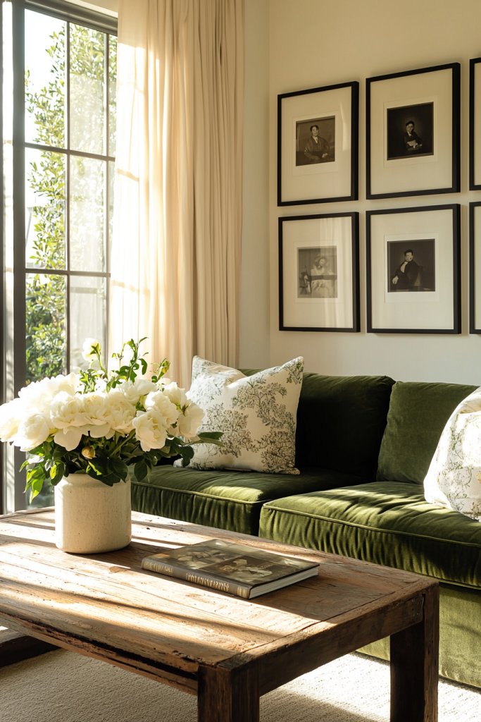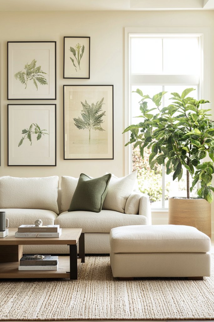 You can start by selecting sage green throw pillows that add just the right touch of color to a neutral sofa. A few carefully chosen art pieces featuring hints of sage can connect the room’s aesthetic, drawing the eye without overwhelming it.