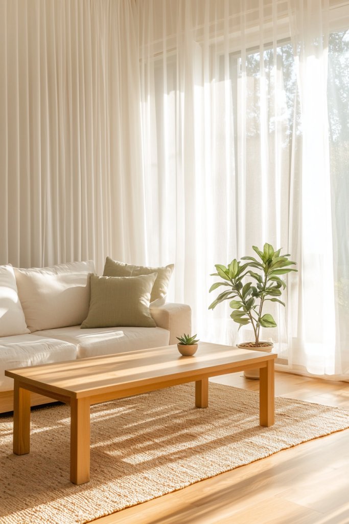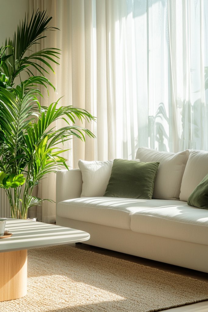 Consider a sage green area rug to anchor the space; its earthy tone complements natural light beautifully. If you’re keen on plants, adding greenery like a potted succulent can harmonize with sage accents, enhancing the organic feel.