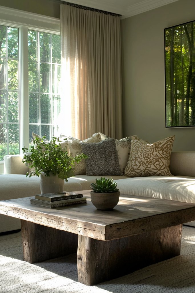 The earthy tones of natural wood bring a sense of groundedness, making your space feel alive and connected to nature. Incorporating wooden elements—a coffee table, shelves, or even exposed beams—adds texture and depth, enhancing the serene vibe of your sage green palette.