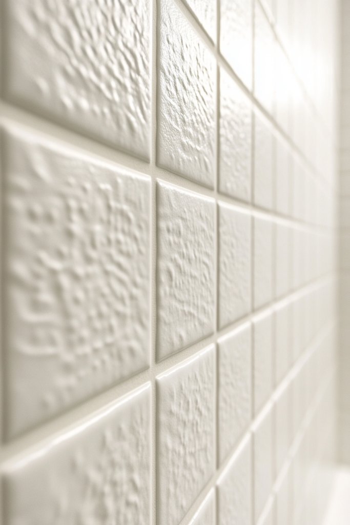 Imagine large, matte white tiles covering every wall, their subtle textures catching the light just enough to add depth. The soft, uniform surface reflects natural sunlight beautifully, making the space feel larger. The slight textured finish adds a tactile element, preventing the room from looking flat or clinical. You might see a hint of shadow play on the tiles, emphasizing their gentle ridges and matte coating. It’s a quiet elegance that whispers simplicity.