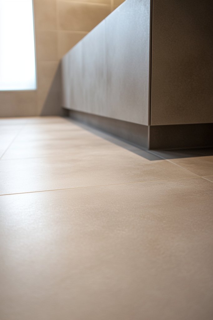 Imagine large, matte grey or beige tiles covering the entire floor, their surface absorbing light and reducing glare. The muted tones create a calming backdrop that enhances the overall minimalist vibe. The matte finish adds texture and depth, making the floor less slippery and more inviting. When paired with light-colored walls and fixtures, it creates a seamless, cohesive space that feels calm and spacious.