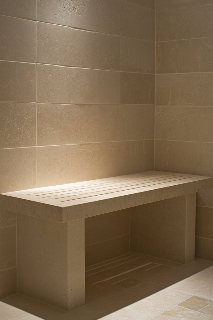 Picture a simple, rectangular bench in smooth, light-colored stone or a softly finished wood. It sits flush against the wall, with clean lines and no unnecessary embellishments. Its neutral tone complements the tiles and fixtures, blending seamlessly into the minimalist design. The bench provides a resting spot for your essentials or a place to sit comfortably during your shower. Its understated elegance adds a spa-like touch.