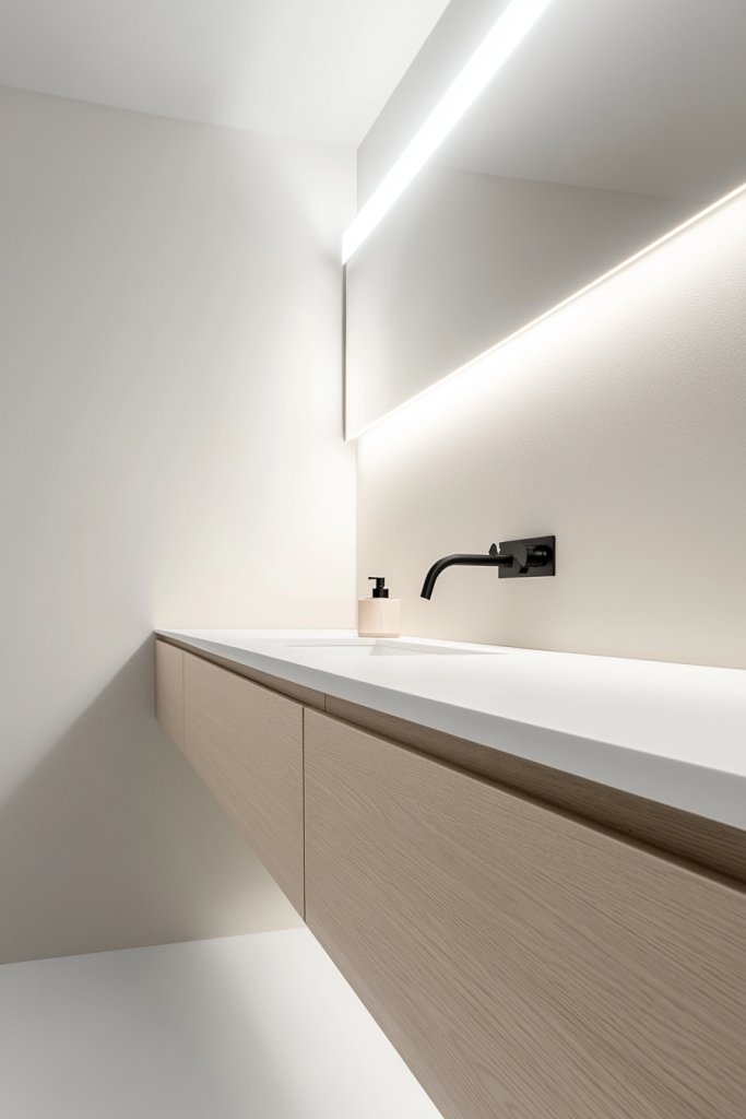 Picture a slender, light wood or matte black floating vanity mounted seamlessly on the wall. Its sleek lines and simple profile make it appear as if it’s floating mid-air, giving the illusion of more space underneath. The clean edge design complements the minimalist aesthetic perfectly. Soft shadows cast beneath the unit add depth, while the open space below makes the room feel less crowded. It’s a perfect blend of form and function.