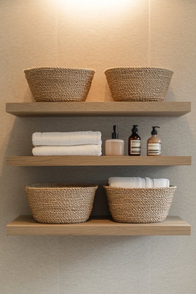Visualize sleek, floating open shelves mounted on walls, holding woven or wooden baskets. These baskets add warmth and texture, softening the clean lines of your minimalist decor. The open shelves showcase neatly organized toiletries, towels, or skincare essentials, all within easy reach. The natural fibers and neutral tones create a calm, inviting atmosphere, while the open design prevents the space from feeling cramped. It’s a simple, effective way to add personality.