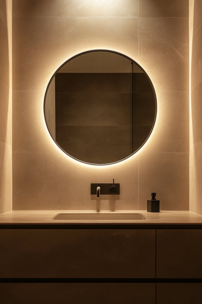 Envision a sleek, matte black or brushed metal thin-framed round mirror mounted above your vanity or sink. Its gentle curves contrast with straight-edged tiles or fixtures, creating a harmonious balance. The minimalist frame highlights the reflective surface without distraction, making it a calming centerpiece. Soft light reflects off the round shape, adding a gentle glow. It’s a simple yet impactful element that elevates the entire room.
