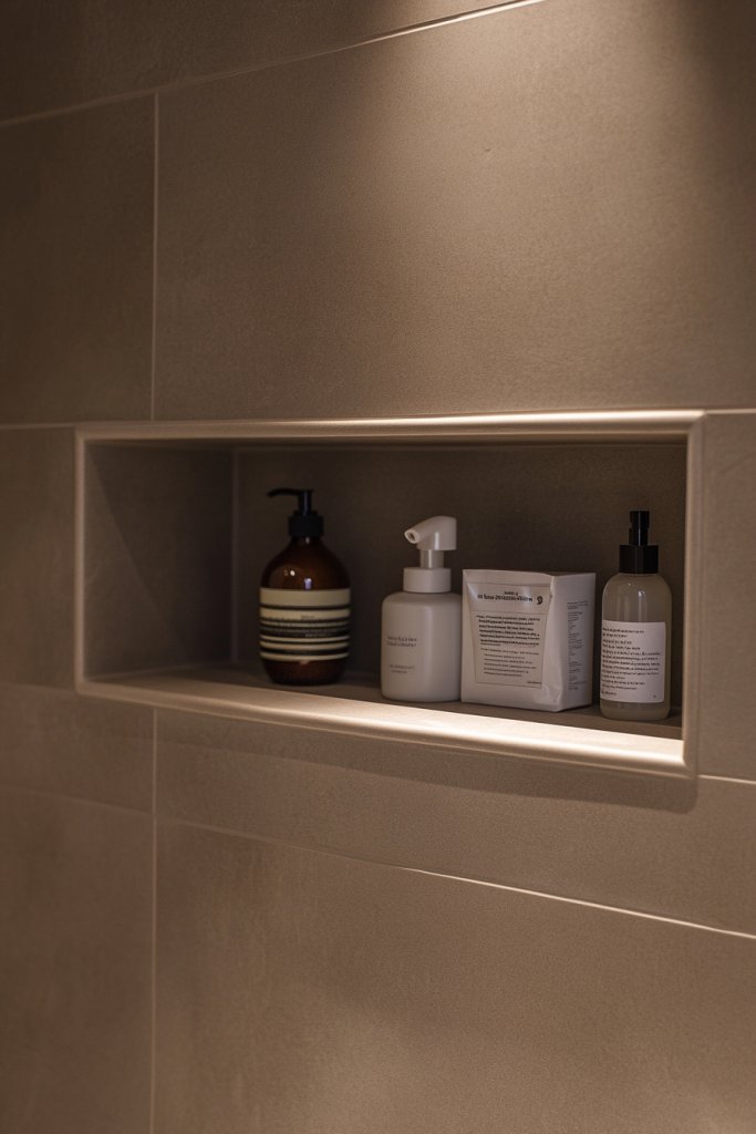 Picture a small, shallow wall niche built flush with the tiles, holding bottles, soap, or small towels. The niche’s edges are smooth and clean, blending perfectly with the surrounding wall. Its subtle depth creates shadow lines that add visual interest without disrupting the minimalist aesthetic. When lit softly, it becomes a functional yet unobtrusive feature. It’s like a secret storage space that’s both practical and elegant.