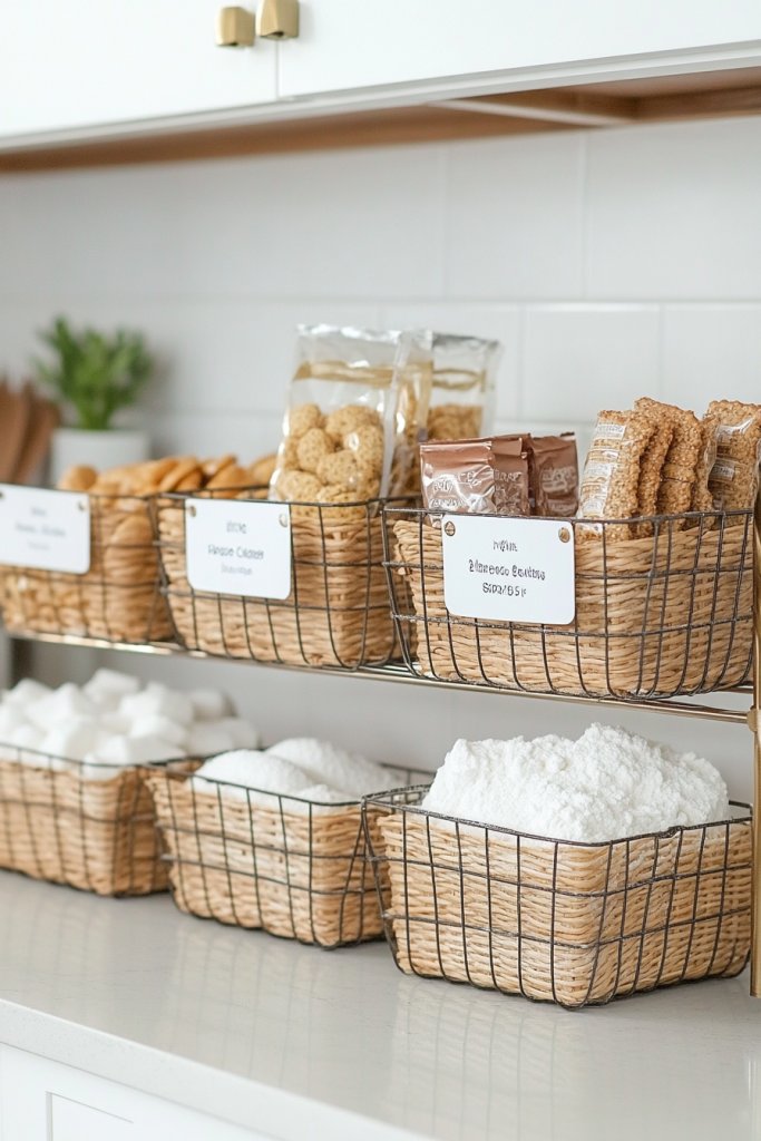 11. Attach Labelled Baskets or Bins for Snack and Baking Supplies