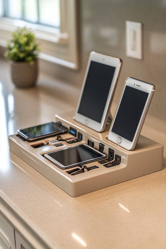 Visualize a sleek, designated corner with a charging dock, cable organizers, and small baskets or trays for storing phones, tablets, and smart kitchen gadgets. The area is tidy, with cords hidden neatly behind a decorative panel or inside a cable management box. It’s a tech oasis that declutters your countertops.