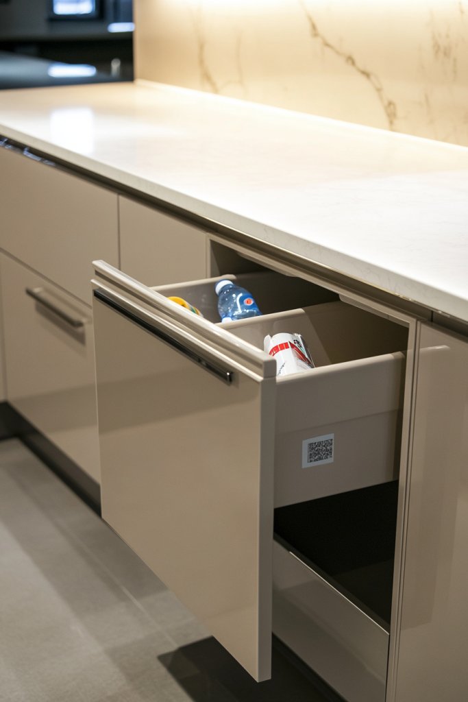 Imagine a sleek cabinet drawer that opens smoothly to reveal two compartments—one for trash, one for recyclables—hidden behind a matching cabinet door. The bins are made of stainless steel or durable plastic, easily removable for cleaning. When closed, the entire unit is flush with your cabinetry, maintaining a minimalist aesthetic.