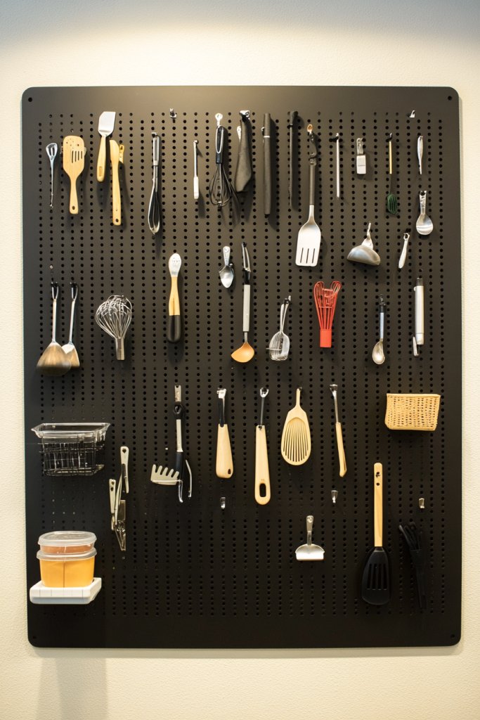 Imagine a large pegboard mounted on a blank wall or inside a cabinet door, filled with hooks, baskets, and shelves holding spatulas, whisks, measuring cups, and more. The tools hang neatly, with their handles facing outward for quick grab-and-go access. The arrangement is both practical and visually appealing, adding an industrial or modern touch.