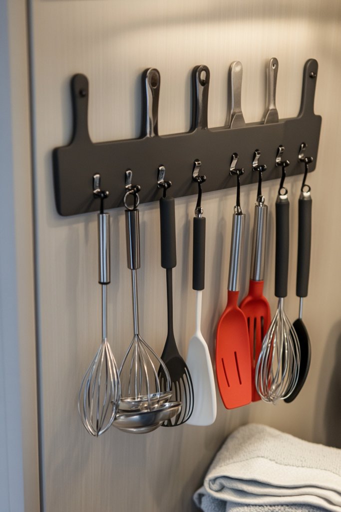 Picture a sturdy hook mounted on the inside of your cabinet door or pantry door, holding a set of colorful silicone spatulas and shiny metal measuring spoons. It keeps everything visible and organized, turning a cluttered drawer into a sleek, accessible display. The hooks blend into your door’s surface, almost like hidden storage that’s always ready for action.