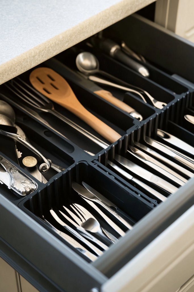 Visualize a deep drawer with neatly separated sections—each slot holding a fork, knife, or spoon in perfect alignment. Small compartments keep gadgets like peelers, bottle openers, and measuring spoons from mingling. The dividers are made of plastic, bamboo, or foam, and slide easily into place, creating a tidy, organized landscape.