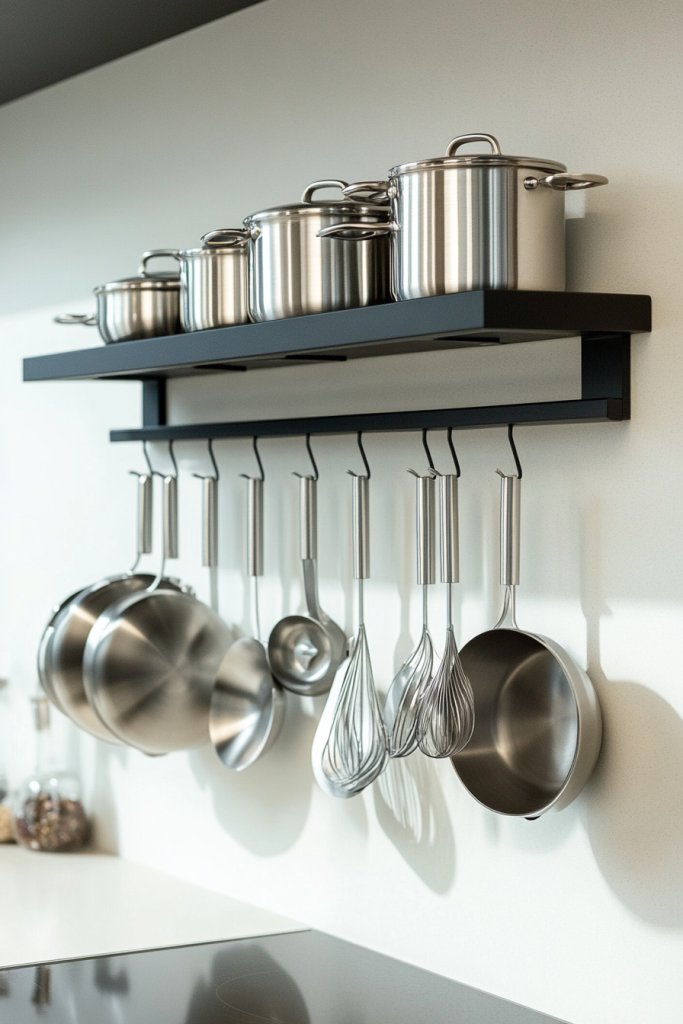 Imagine a sleek, sturdy rack mounted above your stove or along an empty wall, with pots and pans hanging in a neat, organized row. The metal or wood rack complements your kitchen’s style—industrial, rustic, or modern. The cookware’s reflective surfaces catch the light, adding a professional touch to your space.