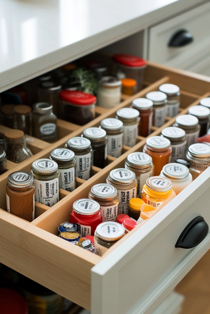 Imagine a shallow drawer filled with adjustable or modular spice racks, each holding tiny jars and bottles in neat rows. The labels are facing up, making it effortless to find your favorite seasoning or oil. The organization creates a clean, minimal look that’s both functional and pleasing to the eye.