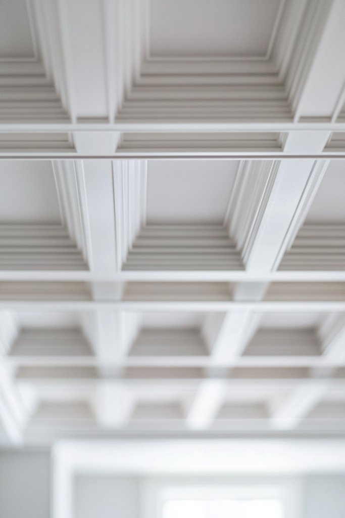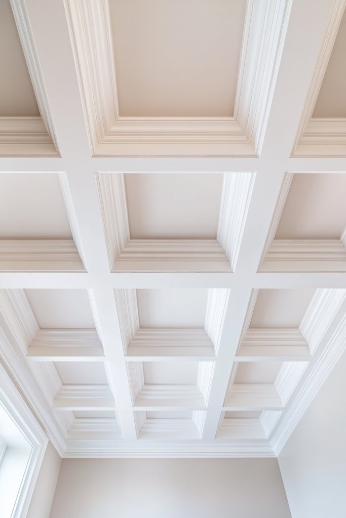 Imagine a pristine white ceiling with perfectly symmetrical square or rectangular coffers, each edged with intricate crown molding. The crisp color enhances natural light, making the room feel brighter and more spacious. The detailed molding adds a touch of craftsmanship, catching the eye with its subtle shadows and highlights. This combination creates a seamless blend of formality and comfort, perfect for dining rooms, living rooms, or home offices.