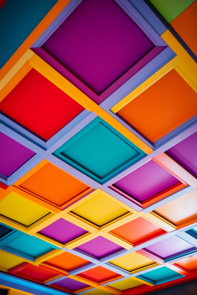 Imagine a ceiling with a variety of geometric shapes—triangles, hexagons, diamonds—in vibrant hues like reds, blues, and yellows. The patterns can be arranged symmetrically or randomly for a more playful look. The bold colors contrast sharply against neutral walls, making the ceiling a focal point. Shadows cast by the shapes add depth, creating a dynamic, almost three-dimensional effect.