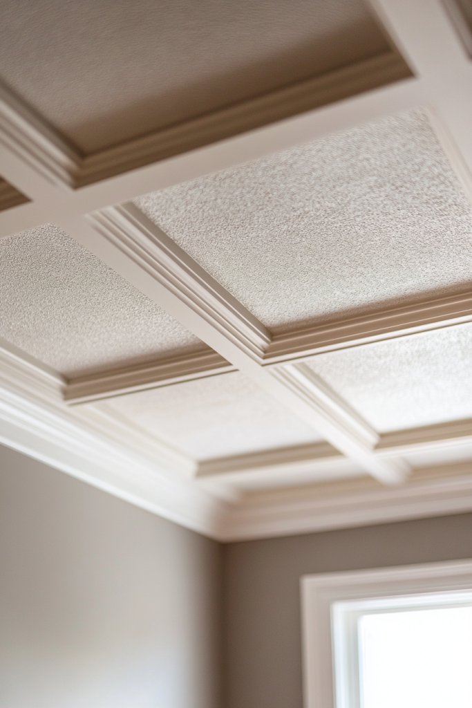 Picture a ceiling with recessed panels featuring a soft, textured surface—like a subtle plaster or grainy paint finish. The textures catch light differently, creating gentle shadows and highlights. The muted color palette enhances the tactile quality, giving the room a cozy, refined feel. It’s like a quiet work of art above your head.