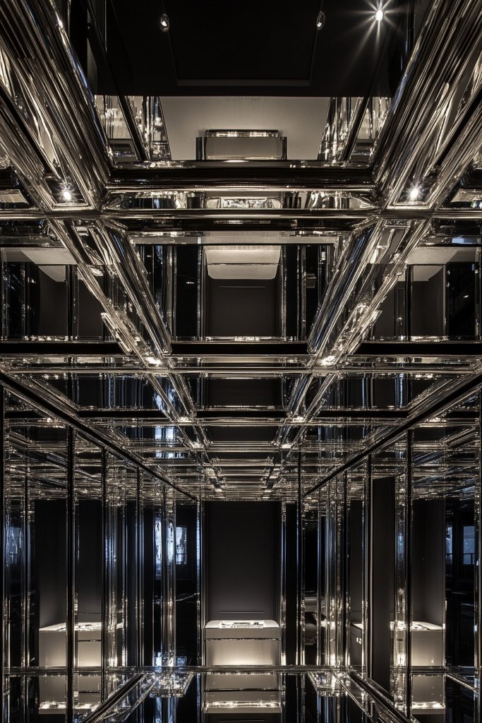 Visualize a ceiling with recessed panels fitted with mirrored surfaces, framed by sleek moldings. The reflections bounce natural and artificial light around the room, instantly brightening the space. The geometric pattern adds structure while the mirrors amplify the room’s dimensions. This design transforms a humble ceiling into a stunning visual feature.
