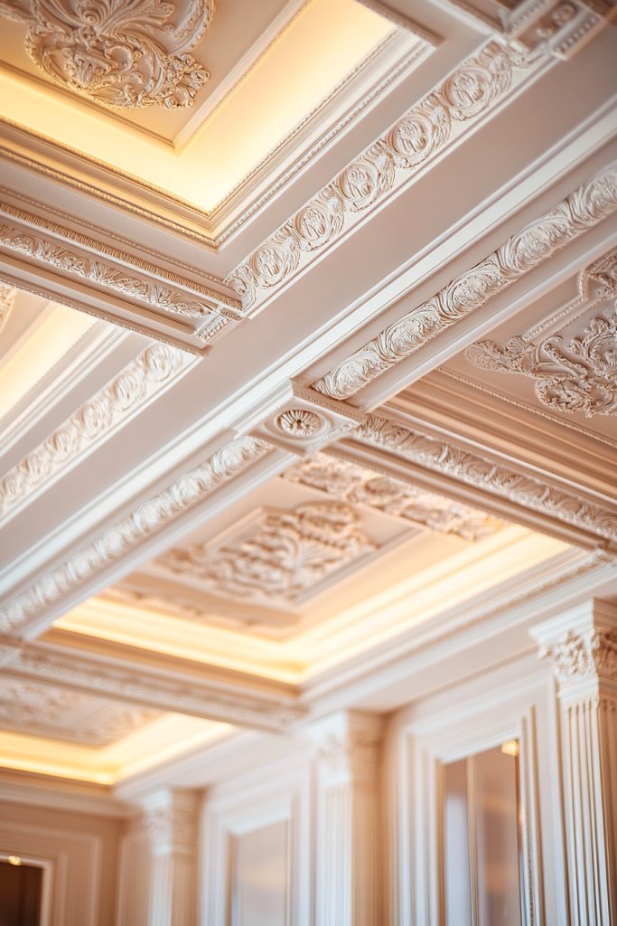 Imagine a ceiling with a series of coffers outlined by ornate crown moldings and decorative cornices. The detailed profiles add depth, shadow, and visual interest. The moldings can be painted in contrasting or matching colors, depending on your style. The overall effect is a layered, sophisticated ceiling that commands attention without overwhelming.