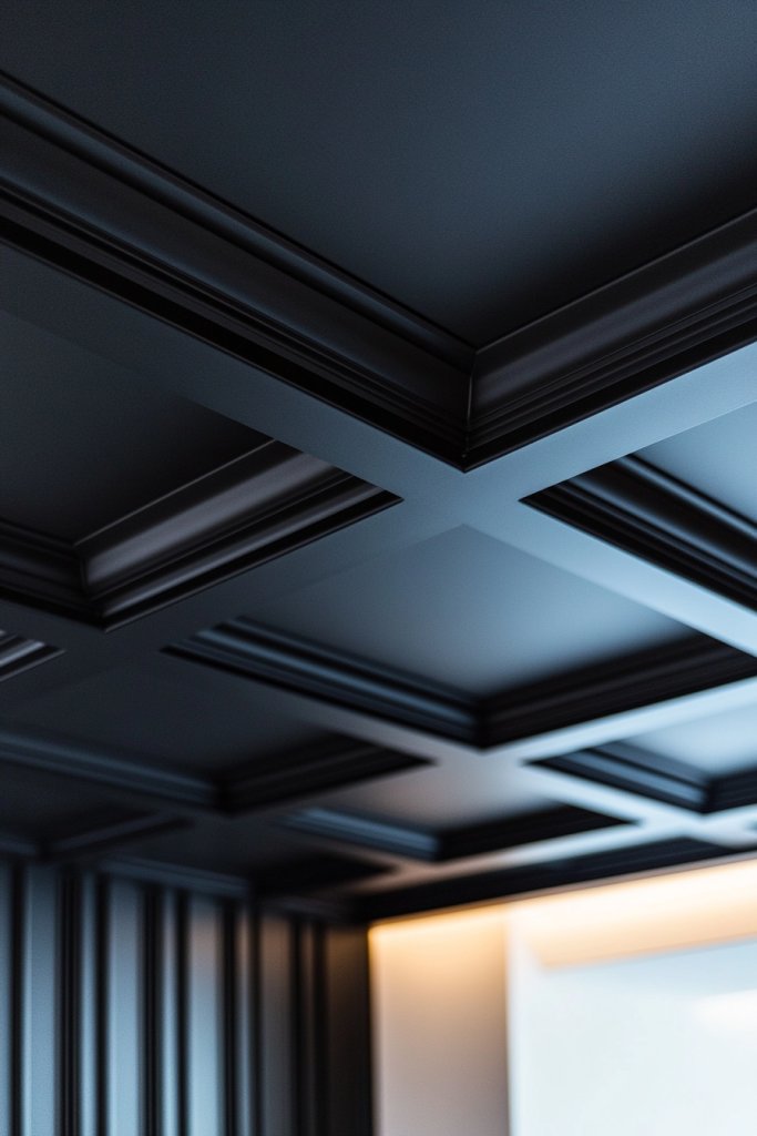Picture a ceiling painted in a velvety matte black, with precisely framed coffered squares that add depth and dimension. The contrast against crisp white walls makes the ceiling pop, drawing your eye upward effortlessly. Soft ambient lighting highlights the texture and matte finish, giving the space a mysterious yet refined glow. It’s like turning your ceiling into a piece of modern art that complements minimalist decor.