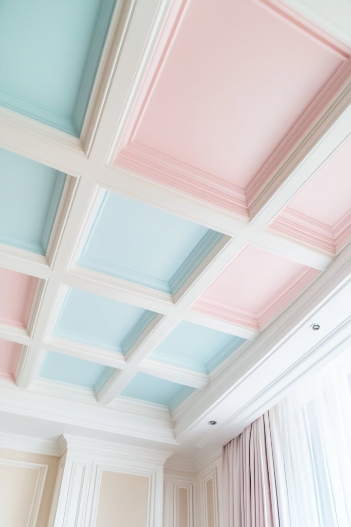 Decorate the edges of the coffers with metallic or pearlescent paint for a gentle shimmer. Add soft textiles like a velvet or silk fabric in the surrounding area to amplify the softness. Installing subtle LED lighting inside or around the coffers can provide a warm glow that enhances the pastel effect. Personal touches like custom trim or gentle curves can make each ceiling uniquely yours.